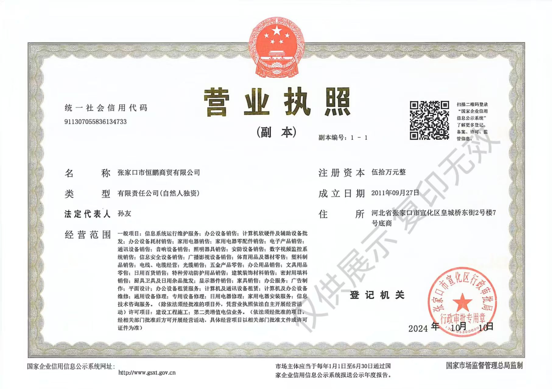 张家口市恒鹏商贸有限公司于2011年9月27日在张家口市宣化区工商局登记注册。我公司的办公地址位于张家口宣化区皇城桥东街2号楼7号底商,营业面积90余平米,仓储面积100平米,我们有好的产品和*业的销售和技术团队,在公司发展*大的7年里,本着*质量产品,*品质服务的经营理念,赢得了市场的认可和客户的信任。先后与张家口地区各大企事业单位建立了良好的合作关系。
